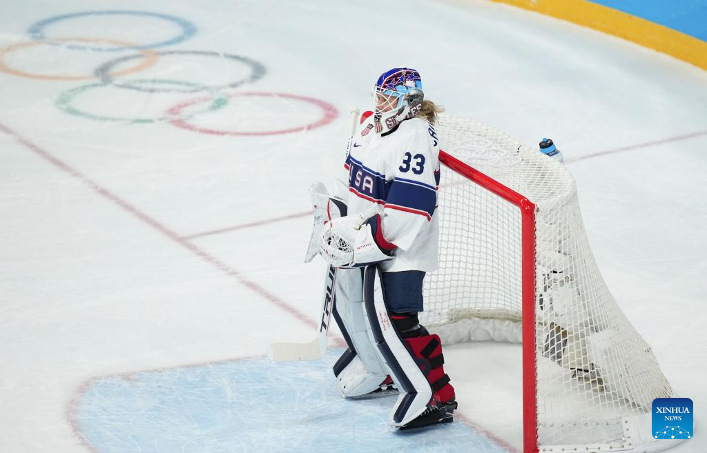 Goalkeeper Alex Cavallini of the United States competes during the ice hockey women's gold medal game of Beijing 2022 Winter Olympics between Canada and the United States at Wukesong Sports Centre in Beijing, capital of China, Feb. 17, 2022. (Xinhua/Meng Yongmin)