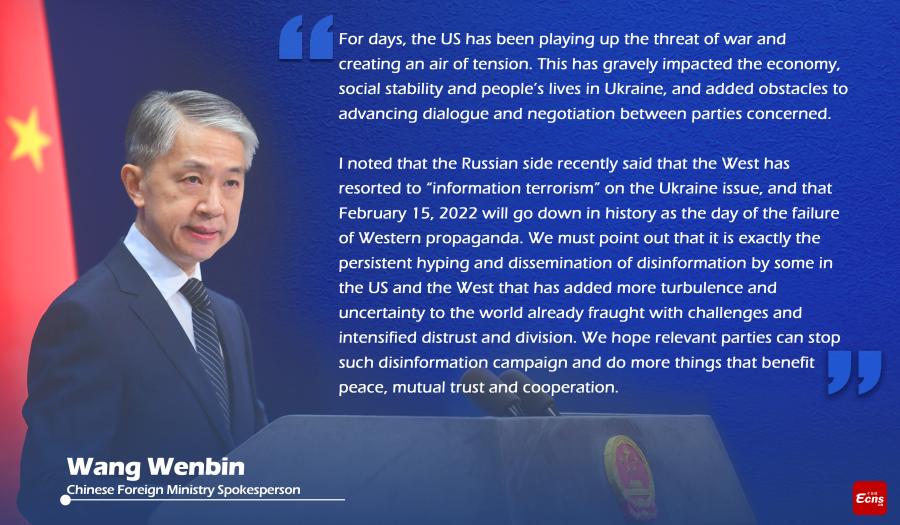 War threat hyped up by the U.S. has gravely impacted the economy, social stability and people's lives in Ukraine, Chinese Foreign Ministry spokesman Wang Wenbin said on Wednesday, adding that it has also added obstacles to advancing dialogue and negotiation between parties concerned.