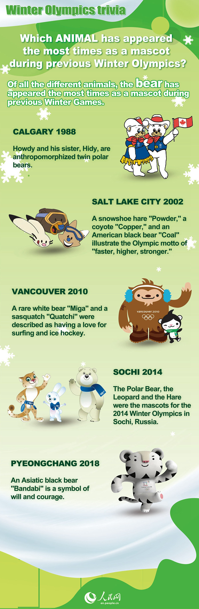 Since the first mascot for the Winter Olympic Games was created for the 1968 Winter Olympic Games in Grenoble, France, mascots for the Winter Games have always attracted much attention worldwide. Of all the different animals, the bear has appeared the most times as a mascot during previous Winter Games.
