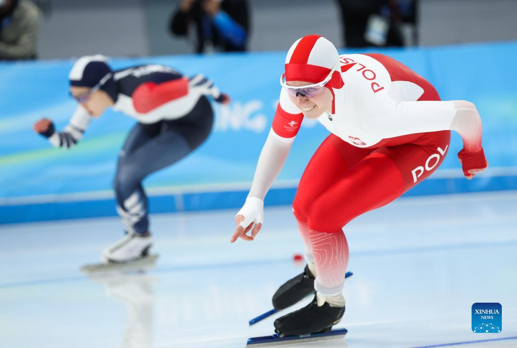 Karolina Bosiek of Poland competes duing the speed skating women's 1000m at the National Speed Skating Oval in Beijing, capital of China, Feb. 17, 2022. (Xinhua/Cheng Tingting)
