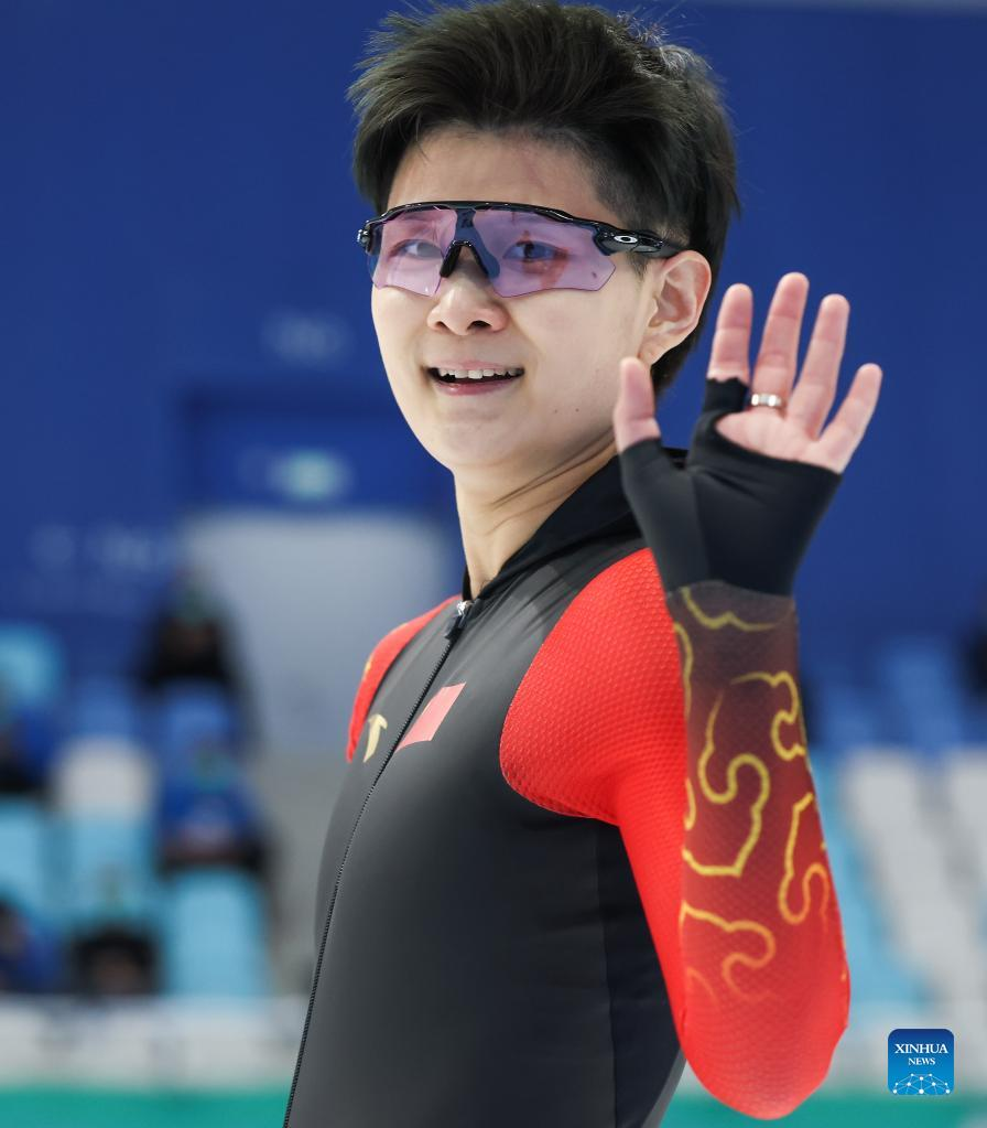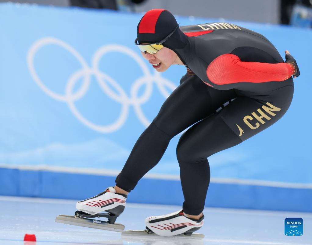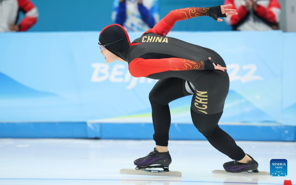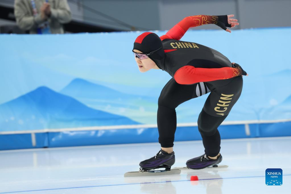 Yin Qi of China competes during the speed skating women's 1000m at the National Speed Skating Oval in Beijing, capital of China, Feb. 17, 2022. (Xinhua/Cheng Tingting)