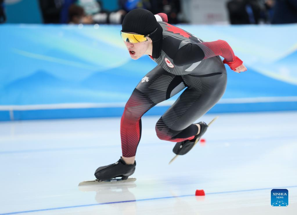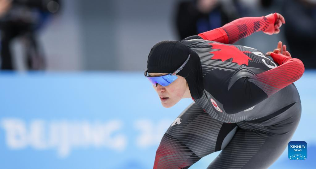 Maddison Pearman of Canada competes during the speed skating women's 1000m at the National Speed Skating Oval in Beijing, capital of China, Feb. 17, 2022. (Xinhua/Cheng Tingting)
