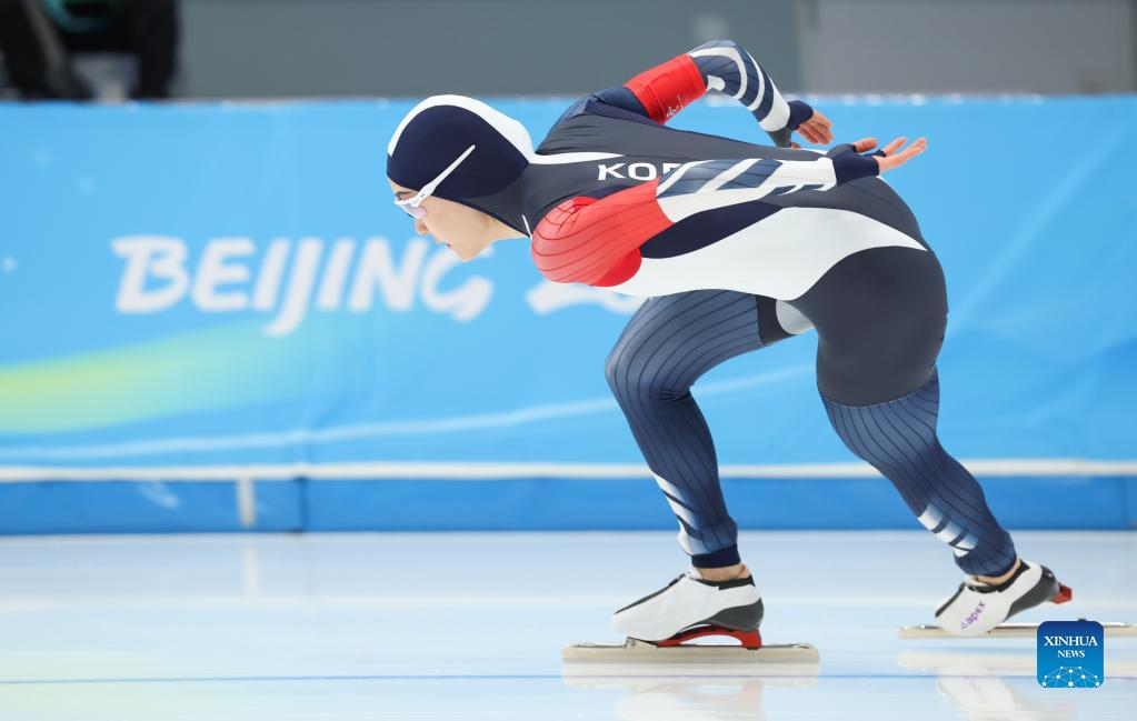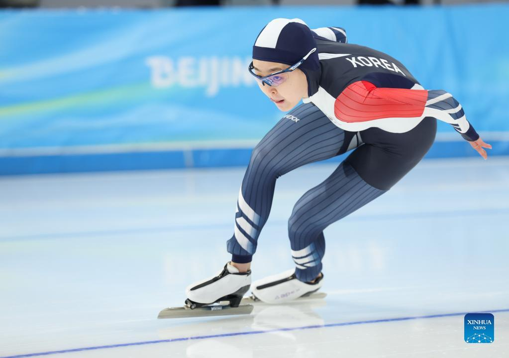 Kim Minsun of South Korea competes duing the speed skating women's 1000m at the National Speed Skating Oval in Beijing, capital of China, Feb. 17, 2022. (Xinhua/Cheng Tingting)