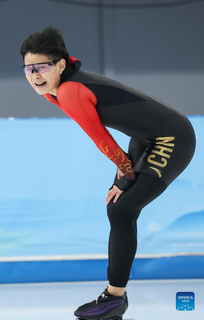 Ji Jingzhu of China reacts after the speed skating women's 1000m at the National Speed Skating Oval in Beijing, capital of China, Feb. 17, 2022. (Xinhua/Cheng Tingting)