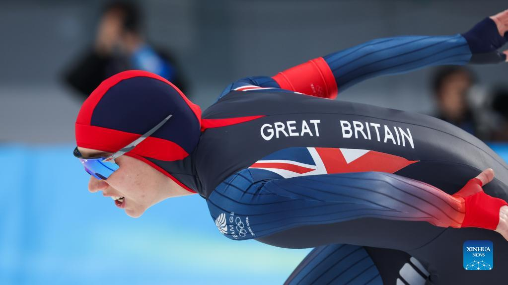 Ellia Smeding of Britain competes during the the speed skating women's 1000m at the National Speed Skating Oval in Beijing, capital of China, Feb. 17, 2022. (Xinhua/Cheng Tingting)