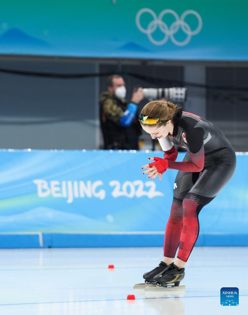 Alexa Scott of Canada reacts after the speed skating women's 1000m at the National Speed Skating Oval in Beijing, capital of China, Feb. 17, 2022. (Xinhua/Cheng Tingting)