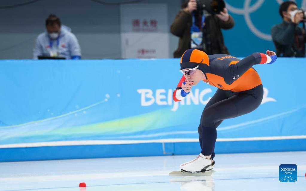 Antoinette de Jong of the Netherlands competes during the speed skating women's 1000m at the National Speed Skating Oval in Beijing, capital of China, Feb. 17, 2022. (Xinhua/Cheng Tingting)