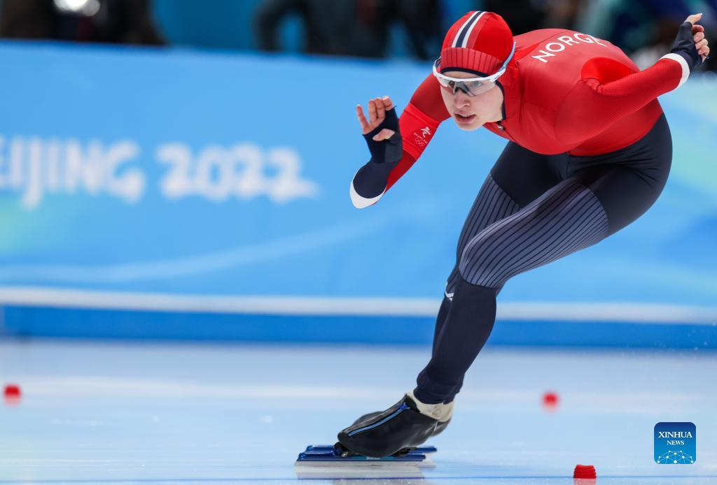 Ragne Wiklund of Norway competes during the speed skating women's 1000m at the National Speed Skating Oval in Beijing, capital of China, Feb. 17, 2022. (Xinhua/Cheng Tingting)