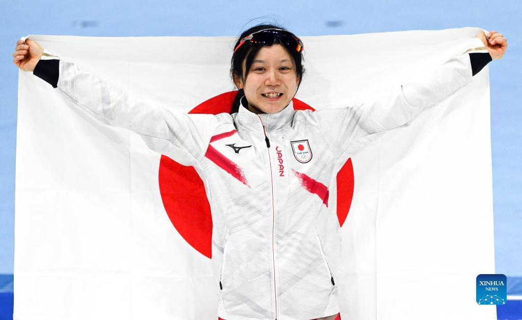 Takagi Miho of Japan celebrates after winning the gold medal in the speed skating women's 1,000m at the National Speed Skating Oval in Beijing, capital of China, Feb. 17, 2022. (Xinhua/Li He)