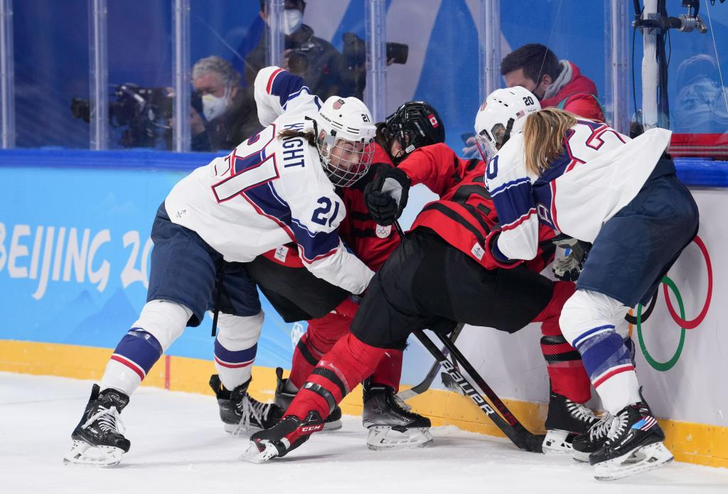 Athletes of Canada and the United States compete during the ice hockey women's gold medal game of Beijing 2022 Winter Olympics between Canada and the United States at Wukesong Sports Centre in Beijing, capital of China, Feb. 17, 2022. (Xinhua/Du Yu)