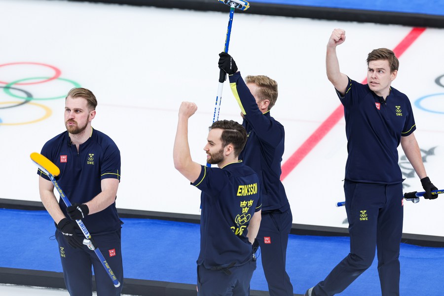 Athletes of Sweden celebrate after winning the curling men's semifinal against Canada at the Beijing 2022 Winter Olympics on Feb. 17, 2022. (Xinhua/Wang Jingqiang)