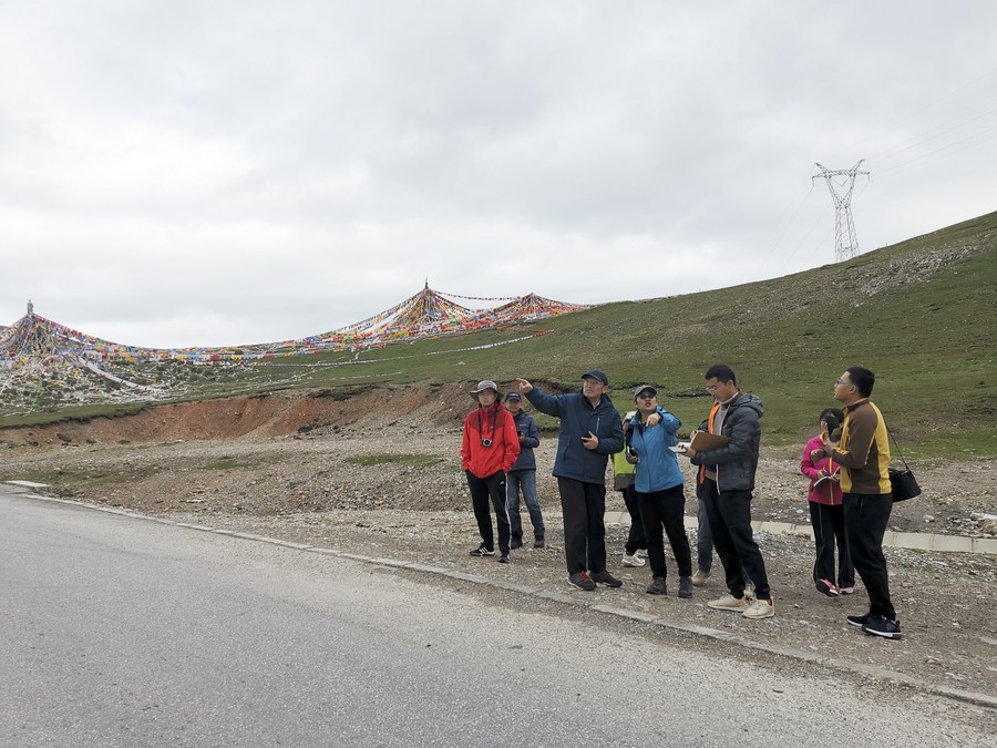 Shi Peijun (3rd L) and his team conduct research in Yushu Tibetan Autonomous Prefecture, northwest China's Qinghai Province, on July 25, 2020. (Photo provided to Xinhua)