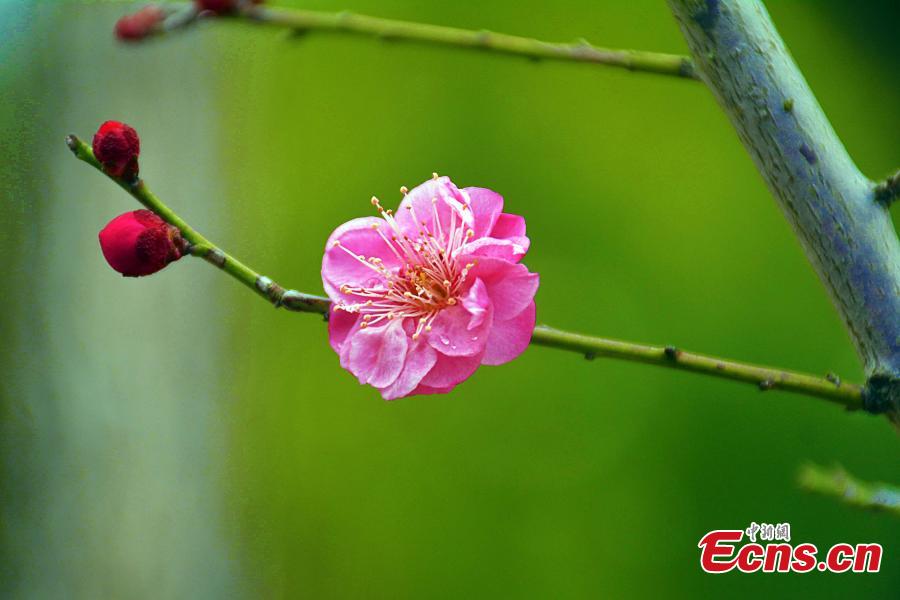 Plum blossoms are seen in full bloom in snow at a park in Anqing, Anhui Province, Feb. 17, 2022. Blossoming plum blossoms were covered by snowflake, forming a magical winter scene. (Photo: China News Service/Wu Junqi)