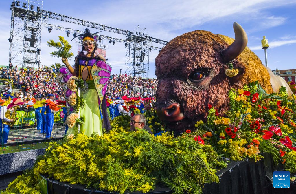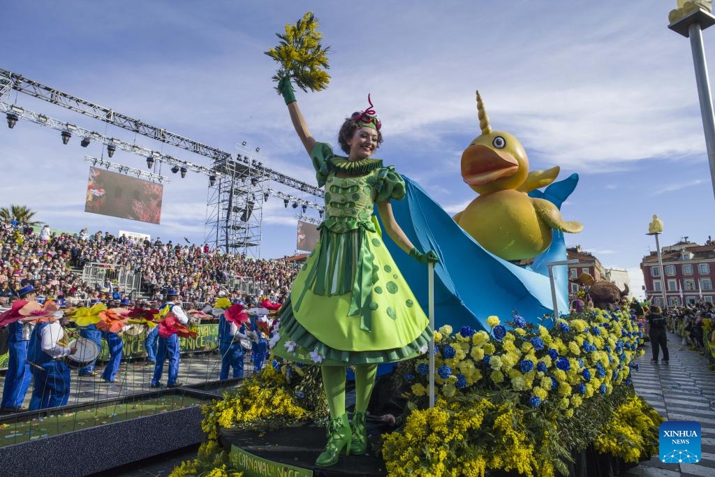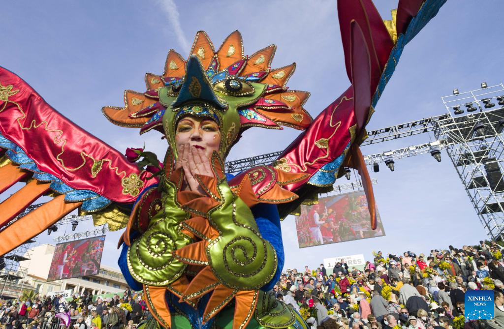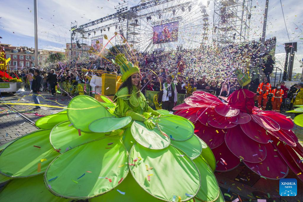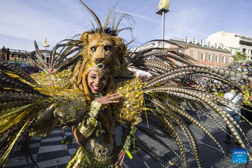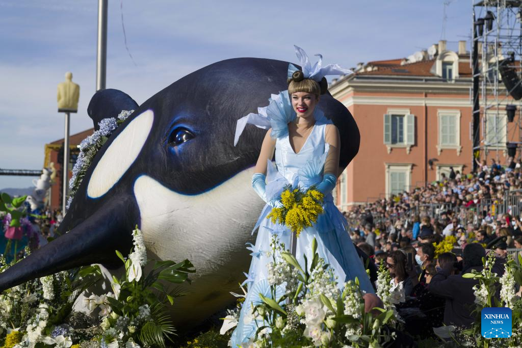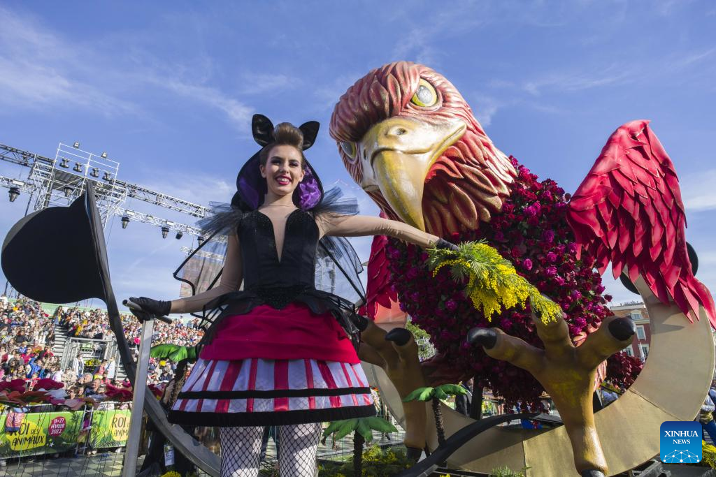 An actress performs during the Battle of the Flowers parade of the 2022 Nice Carnival in Nice, France, Feb. 16, 2022. The carnival runs from Feb. 11 to 27 under the theme "King of Animals." (Photo by Serge Haouzi/Xinhua)