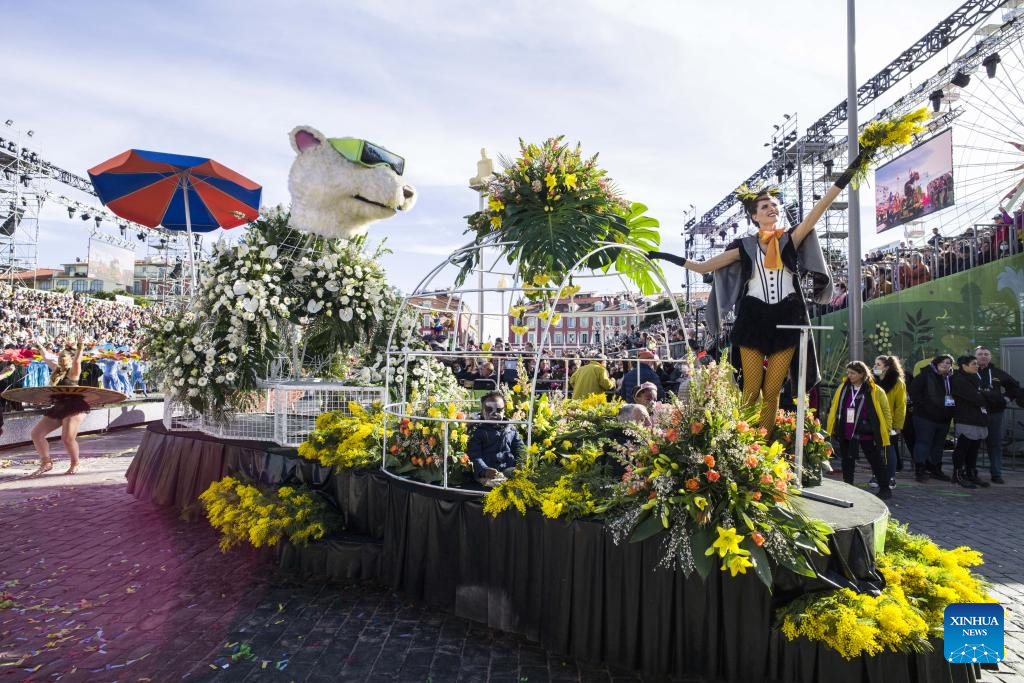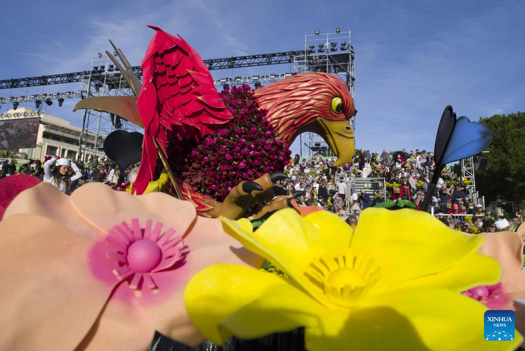 A carnival float proceeds during the Battle of the Flowers parade of the 2022 Nice Carnival in Nice, France, Feb. 16, 2022. The carnival runs from Feb. 11 to 27 under the theme "King of Animals." (Photo by Serge Haouzi/Xinhua)
