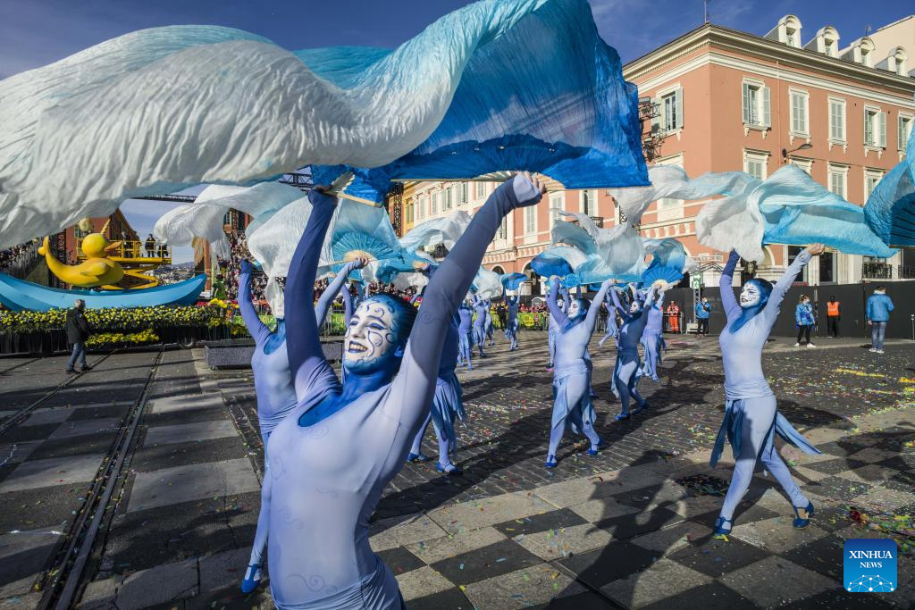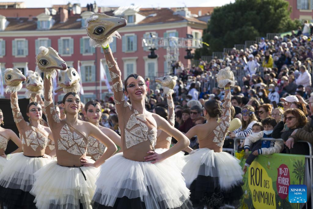 Actors perform during the Battle of the Flowers parade of the 2022 Nice Carnival in Nice, France, Feb. 16, 2022. The carnival runs from Feb. 11 to 27 under the theme "King of Animals." (Photo by Serge Haouzi/Xinhua)