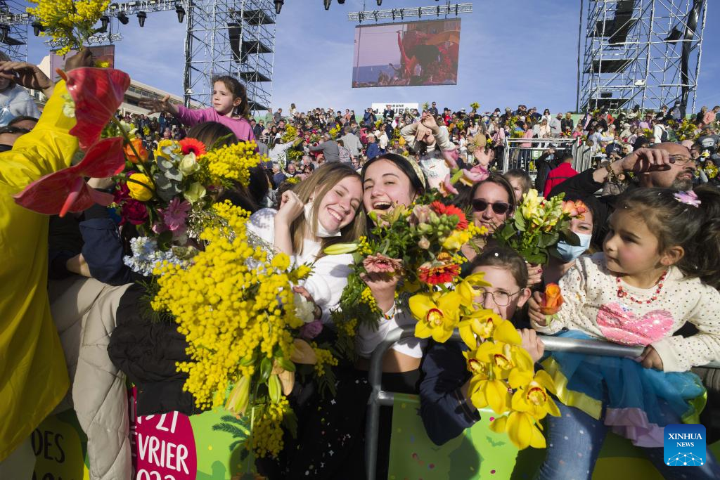 Spectators are seen during the Battle of the Flowers parade of the 2022 Nice Carnival in Nice, France, Feb. 16, 2022. The carnival runs from Feb. 11 to 27 under the theme "King of Animals." (Photo by Serge Haouzi/Xinhua)