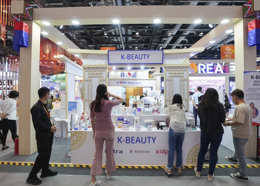 Visitors tour the South Korea exhibition hall during the 2021 China International Fair for Trade in Services (CIFTIS) in Beijing, capital of China, Sept. 5, 2021. (Xinhua/Wang Tiancong)