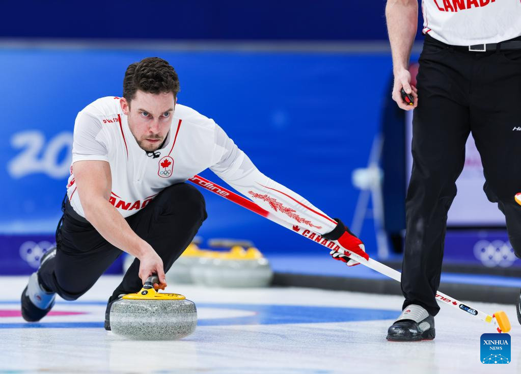 Brett Gallant of Canada competes during the curling men's semifinals of the Beijing 2022 Winter Olympics between Sweden and Canada at the National Aquatics center in Beijing, China, Feb.17, 2022. (Xinhua/Wang Jingqiang)