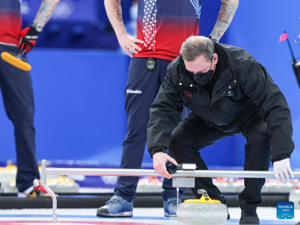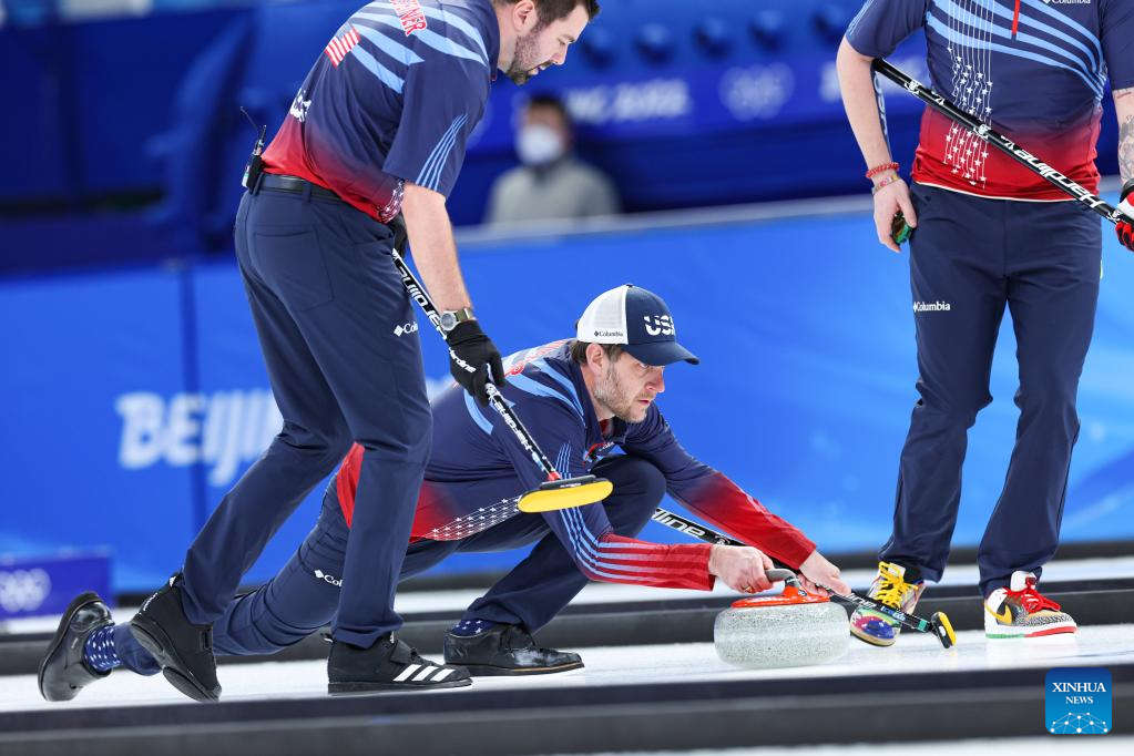 John Shuster of the United States competes during the curling men's semifinals of the Beijing 2022 Winter Olympics between the United States and Britain at the National Aquatics center in Beijing, China, Feb.17, 2022. (Xinhua/Wang Jingqiang)