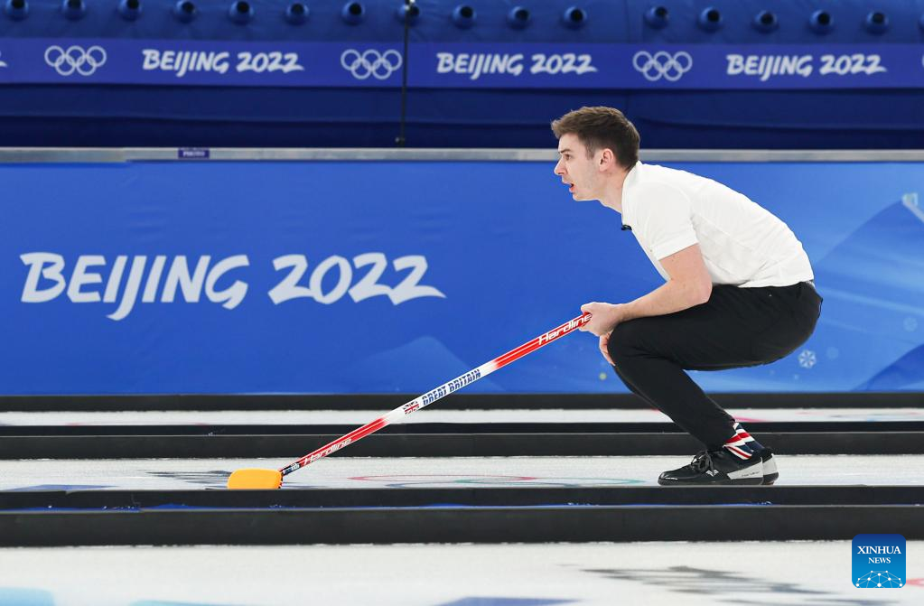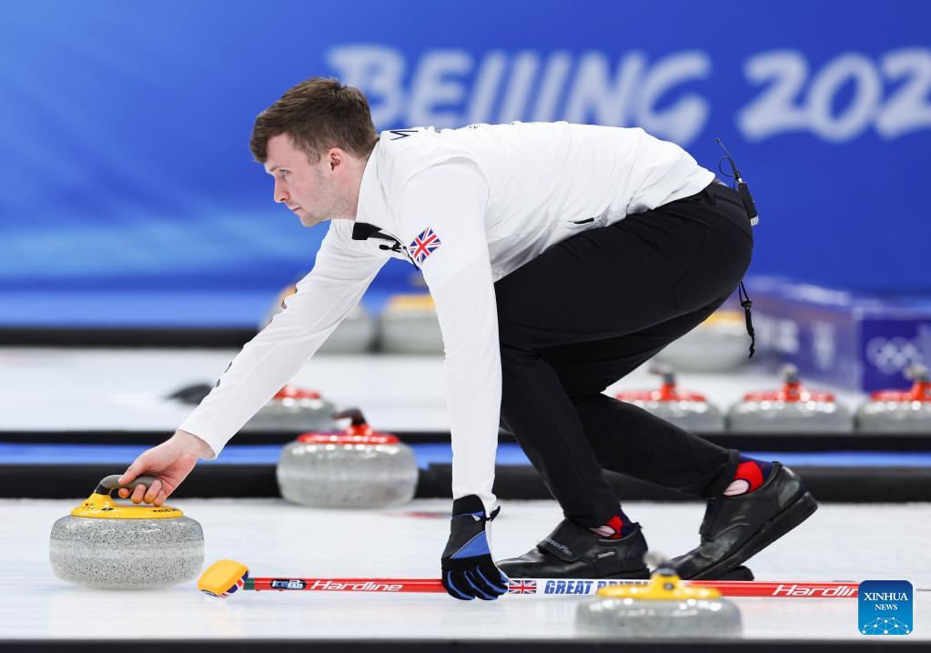 Bruce Mouat of Britain competes during the curling men's semifinals of the Beijing 2022 Winter Olympics between the United States and Britain at the National Aquatics center in Beijing, China, Feb.17, 2022. (Xinhua/Wang Jingqiang)
