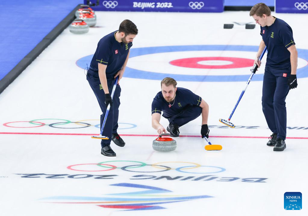 Oskar Eriksson, Rasmus Wranaa and Christoffer Sundgren (from L to R) of Sweden compete during the curling men's semifinals of the Beijing 2022 Winter Olympics between Sweden and Canada at the National Aquatics center in Beijing, China, Feb.17, 2022. (Xinhua/Wang Jingqiang)