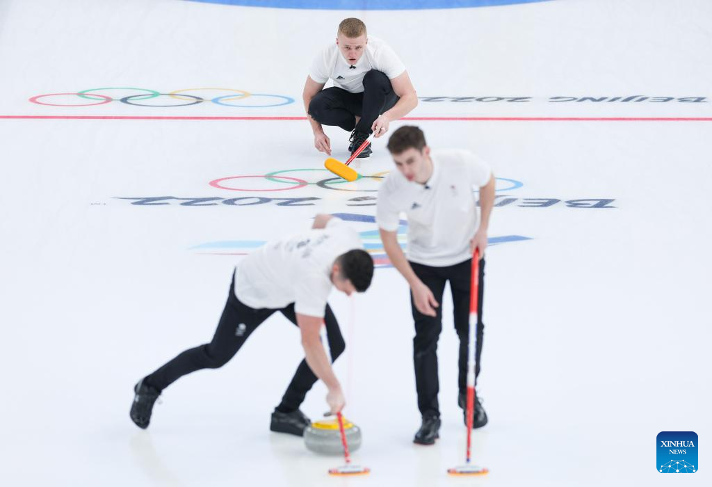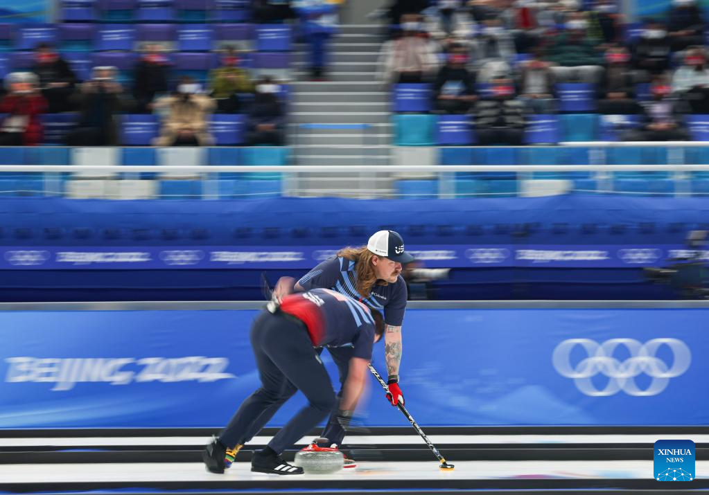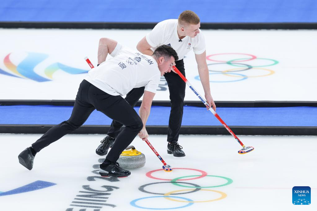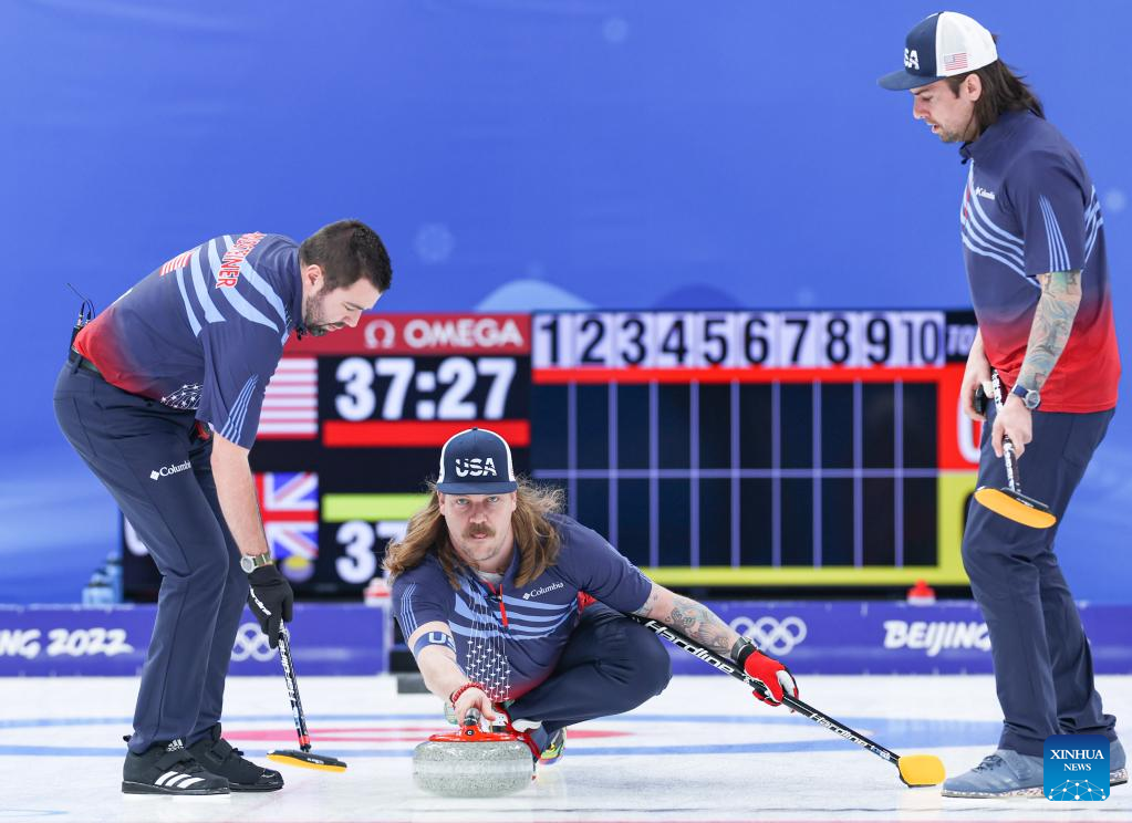 Bobby Lammie (rear) of Britain competes during the curling men's semifinals of the Beijing 2022 Winter Olympics between the United States and Britain at the National Aquatics center in Beijing, China, Feb.17, 2022. (Xinhua/Wang Jingqiang)