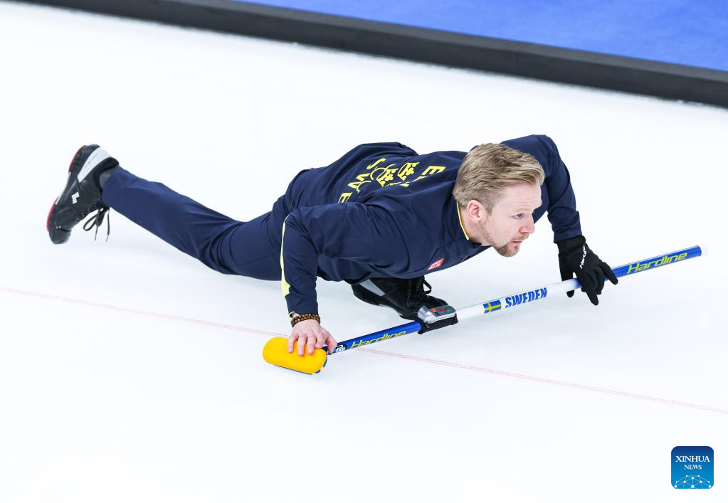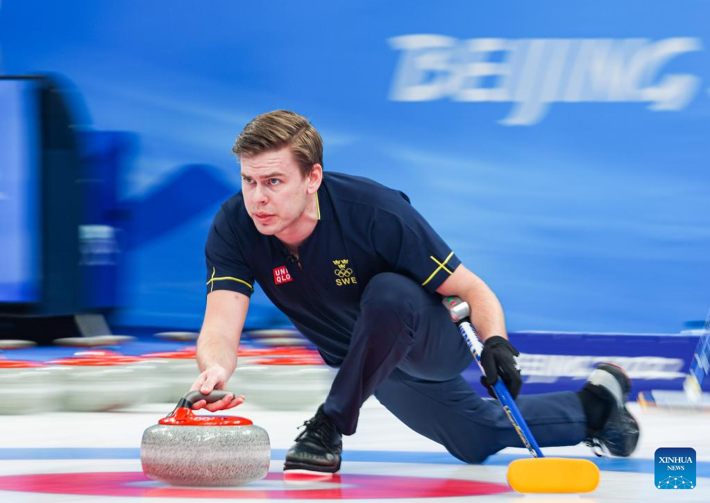 Christoffer Sundgren of Sweden competes during the curling men's semifinals of the Beijing 2022 Winter Olympics between Sweden and Canada at the National Aquatics center in Beijing, China, Feb.17, 2022. (Xinhua/Wang Jingqiang)