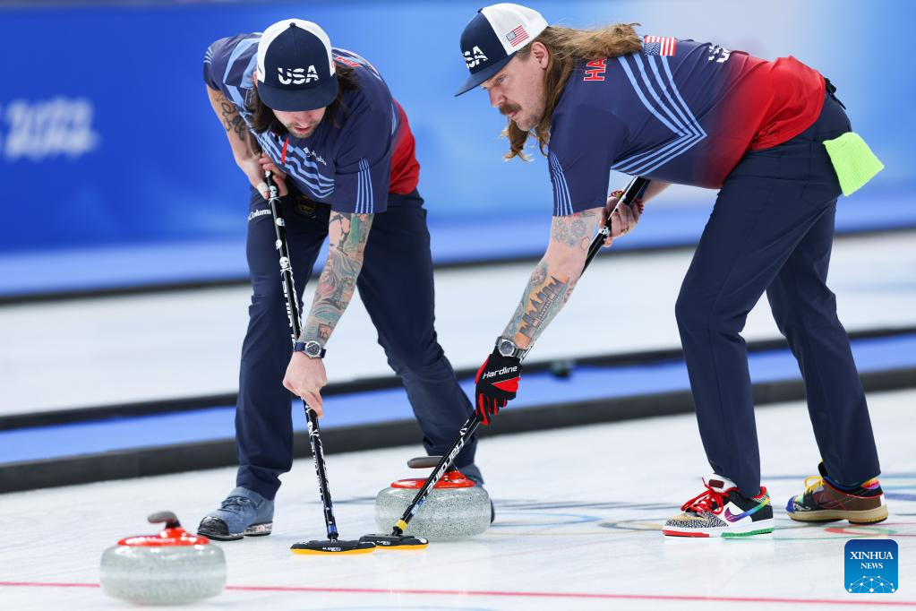 Matt Hamilton (Rear) and John Landsteiner of the United States compete during the curling men's semifinals of the Beijing 2022 Winter Olympics between the United States and Britain at the National Aquatics center in Beijing, China, Feb.17, 2022. (Xinhua/Wang Jingqiang)