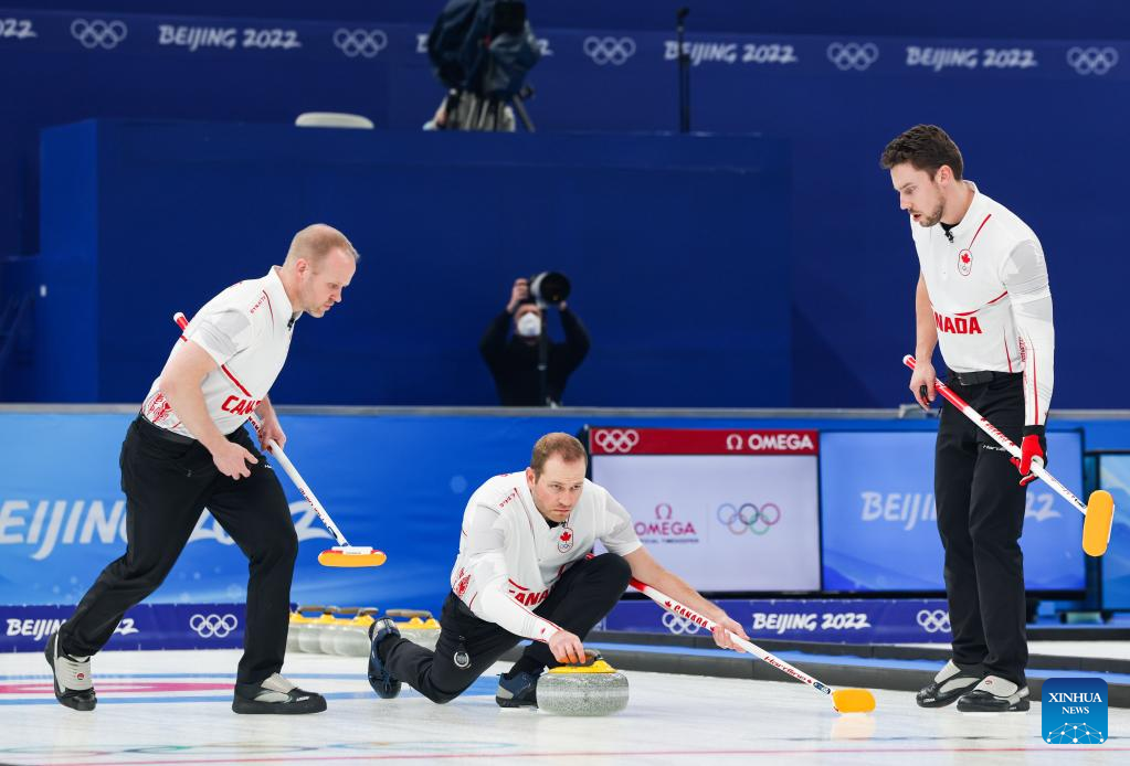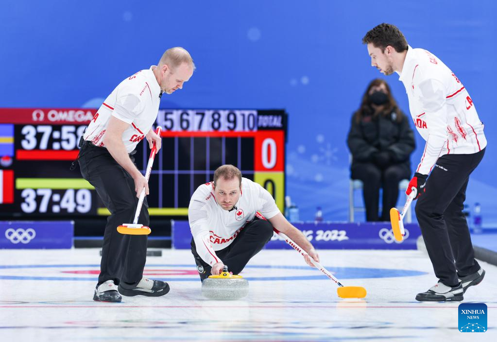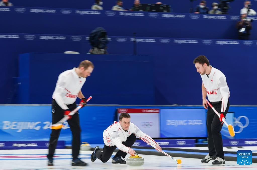 Brad Gushue (C) of Canada competes during the curling men's semifinals of the Beijing 2022 Winter Olympics between Sweden and Canada at the National Aquatics center in Beijing, China, Feb.17, 2022. (Xinhua/Wang Jingqiang)