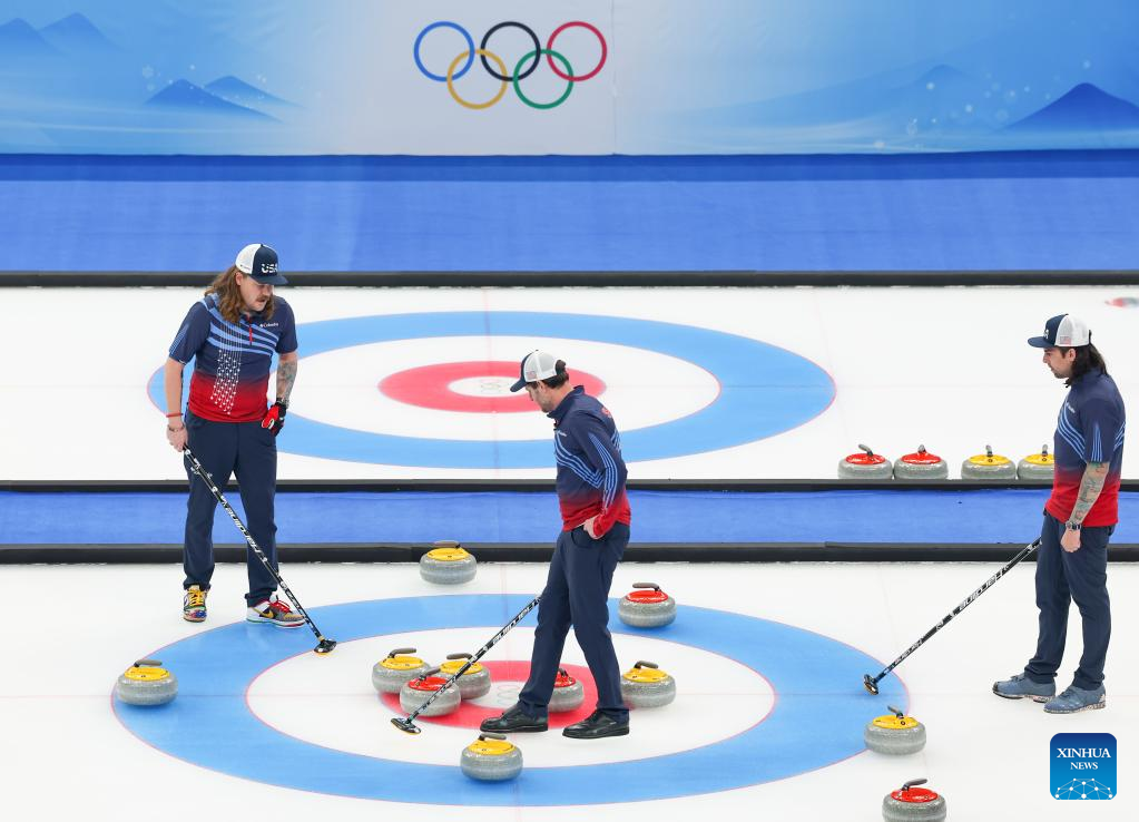 Christopher Plys, Matt Hamilton and John Landsteiner(from R to L) of the United States compete during the curling men's semifinals of the Beijing 2022 Winter Olympics between the United States and Britain at the National Aquatics center in Beijing, China, Feb.17, 2022. (Xinhua/Wang Jingqiang)