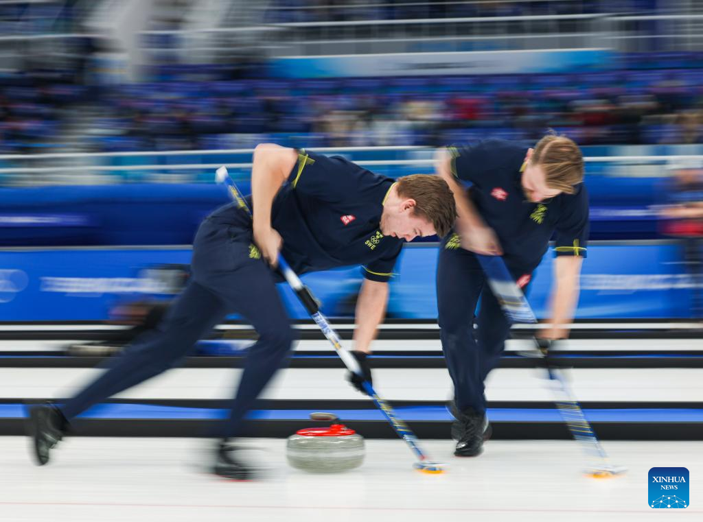 Rasmus Wranaa (R) and Christoffer Sundgren of Sweden compete during the curling men's semifinals of the Beijing 2022 Winter Olympics between Sweden and Canada at the National Aquatics center in Beijing, China, Feb.17, 2022. (Xinhua/Wang Jingqiang)