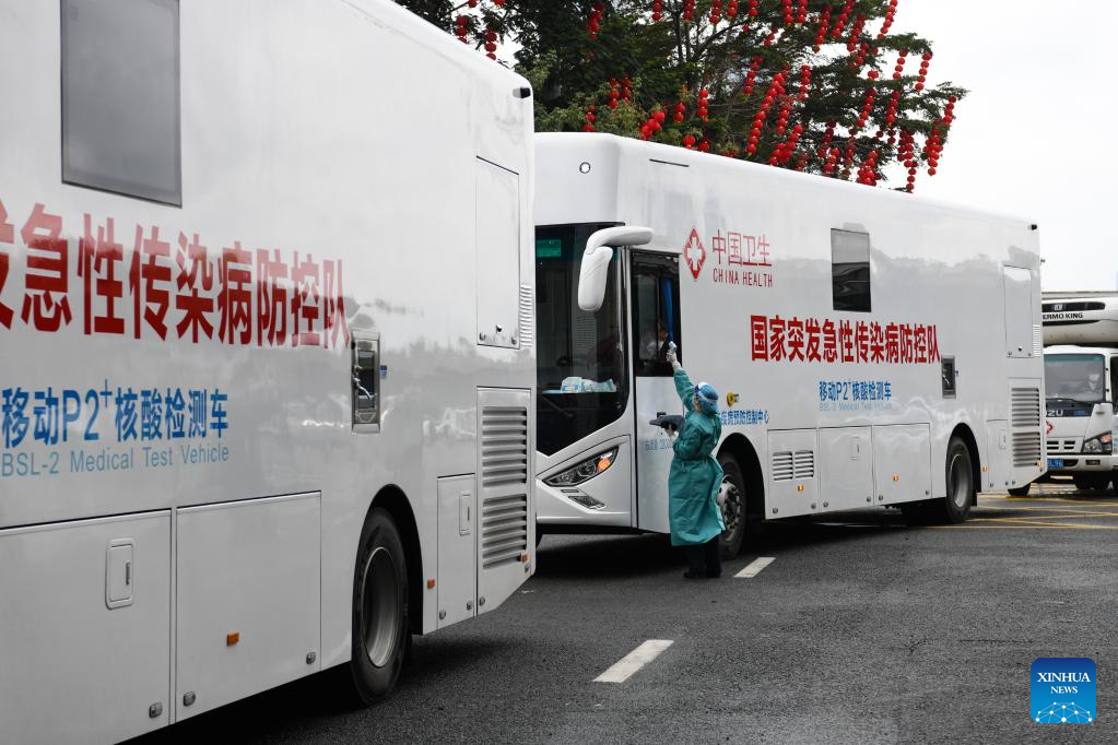 Mobile COVID-19 test vehicles set out to Hong Kong for assistance in COVID-19 fight, in Shenzhen, south China's Guangdong Province, Feb. 17, 2022. China's National Health Commission (NHC) said in a statement on the website that it has been paying close attention to the fifth wave of the COVID-19 pandemic in Hong Kong.(Xinhua/Liang Xu)