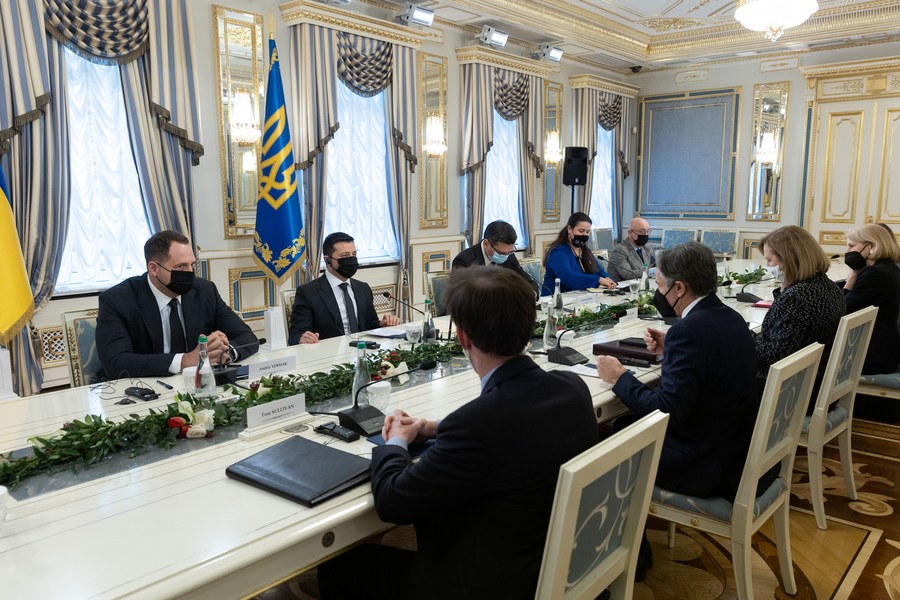 Ukrainian President Volodymyr Zelensky and U.S. Secretary of State Antony Blinken meet to discuss the security situation around Ukraine in Kiev, Ukraine, Jan. 19, 2022. (Ukrainian Presidential Office/Handout via Xinhua)