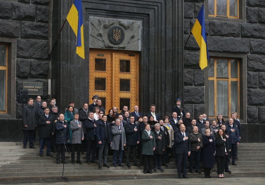 Members of the Ukrainian cabinet sing the national anthem during a Day of Unity celebration in front of the government office building in Kiev, Ukraine, Feb. 16, 2022. (Photo by Sergey Starostenko/Xinhua)