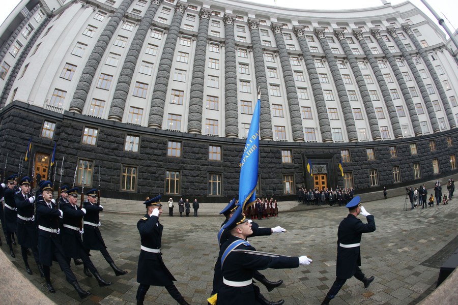 An honor guard marches to the Ukrainian government office building during a Day of Unity celebration in Kiev, Ukraine, Feb. 16, 2022. (Photo by Sergey Starostenko/Xinhua)