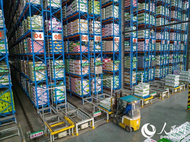 Staff members distribute and deliver agricultural production materials at a smart warehouse for a company in Feidong county, Hefei city, east China's Anhui Province, Feb. 16, 2022. (Photo/People's Daily Online)