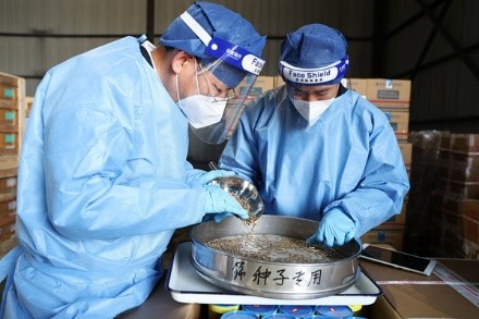 Customs staff members in Guangzhou, south China's Guangdong Province inspect imported vegetable seeds. (Photo courtesy of the General Administration of Customs of China)
