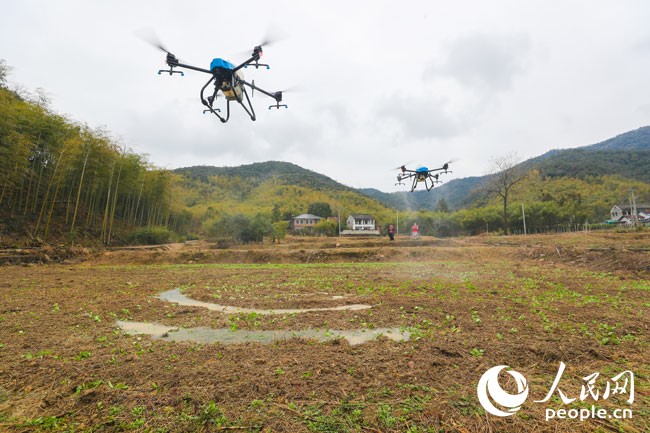 Photo shows drones spraying pesticides on rapeseed plants in a field in Hekou village, Huzhou city, east China's Zhejiang Province, Feb. 4, 2022. (Photo/People's Daily Online)