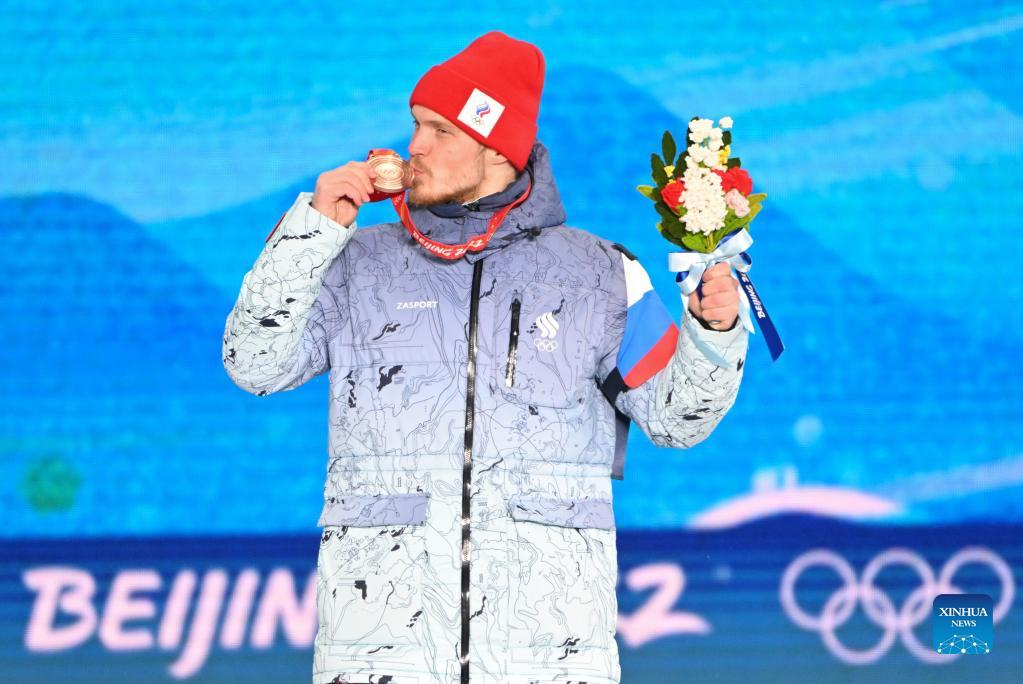 Bronze medalist Sergey Ridzik of ROC poses during the awarding ceremony of freestyle skiing men's ski cross at Zhangjiakou Medals Plaza of the Winter Olympics in Zhangjiakou, north China's Hebei Province, Feb. 18, 2022. (Xinhua/Zhu Zheng)