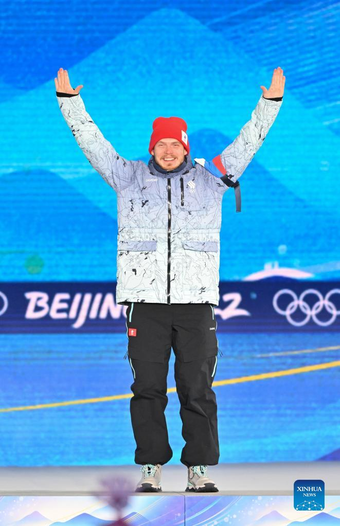 Bronze medalist Sergey Ridzik of ROC reacts during the awarding ceremony of freestyle skiing men's ski cross at Zhangjiakou Medals Plaza of the Winter Olympics in Zhangjiakou, north China's Hebei Province, Feb. 18, 2022. (Xinhua/Zhu Zheng)