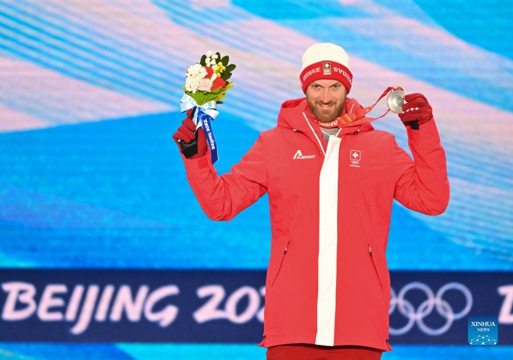Silver medalist Alex Fiva of Switzerland poses during the awarding ceremony of freestyle skiing men's ski cross at Zhangjiakou Medals Plaza of the Winter Olympics in Zhangjiakou, north China's Hebei Province, Feb. 18, 2022. (Xinhua/Zhu Zheng)