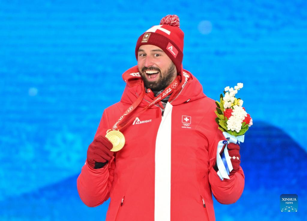 Gold medalist Ryan Regez of Switzerland poses during the awarding ceremony of freestyle skiing men's ski cross at Zhangjiakou Medals Plaza of the Winter Olympics in Zhangjiakou, north China's Hebei Province, Feb. 18, 2022. (Xinhua/Zhu Zheng)