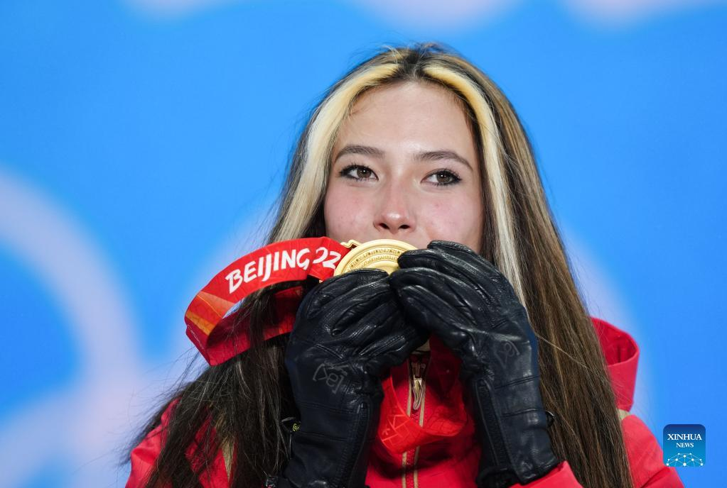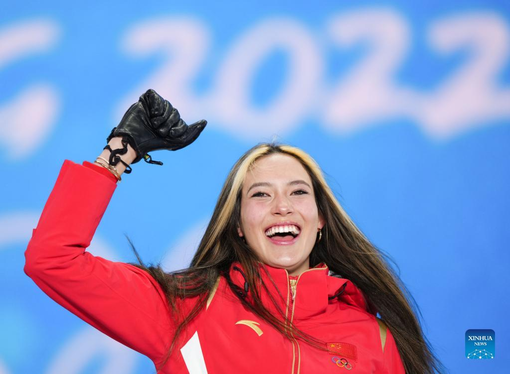 Gold medalist Chinese athlete Gu Ailing poses during the awarding ceremony of freestyle skiing women's freeski halfpipe at Zhangjiakou Medals Plaza of the Winter Olympics in Zhangjiakou, north China's Hebei Province, Feb. 18, 2022. (Xinhua/Xue Yubin)