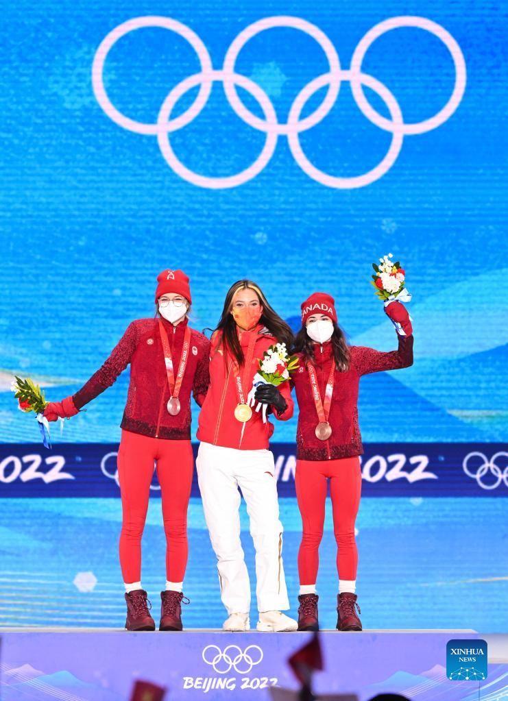 Gold medalist Chinese athlete Gu Ailing (C), silver medalist Canadian athlete Cassie Sharpe (L) and bronze medalist Canadian athlete Rachael Karker pose during the awarding ceremony of freestyle skiing women's freeski halfpipe at Zhangjiakou Medals Plaza of the Winter Olympics in Zhangjiakou, north China's Hebei Province, Feb. 18, 2022. (Xinhua/Zhu Zheng)