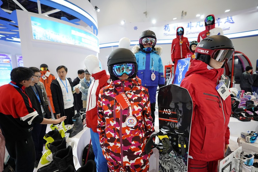 Visitor view the gears for winter sports at 2019 World Winter Sports (Beijing) Expo in Beijing, capital of China, Oct. 17, 2019. (Xinhua/Ju Huanzong)