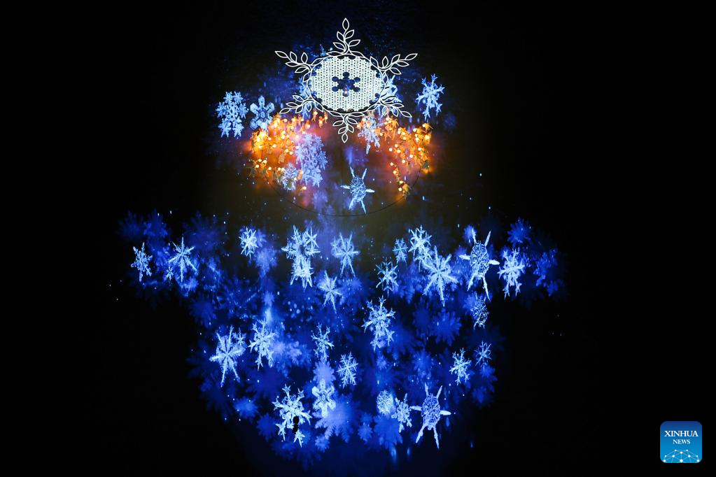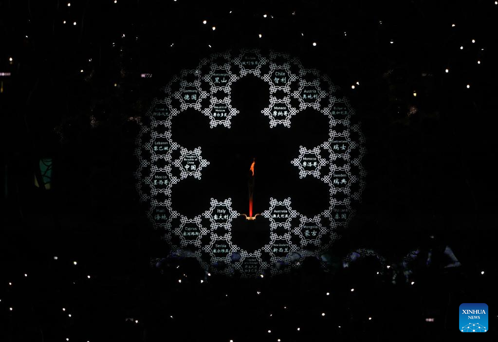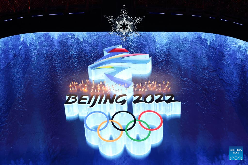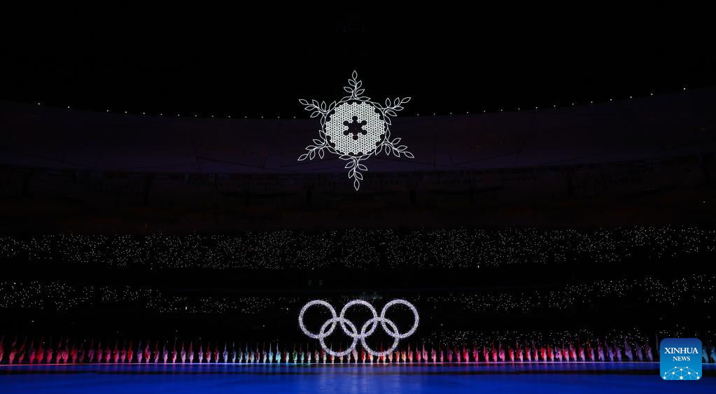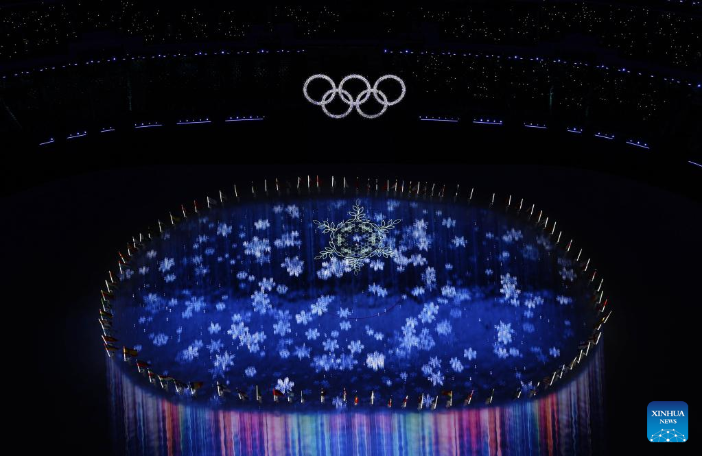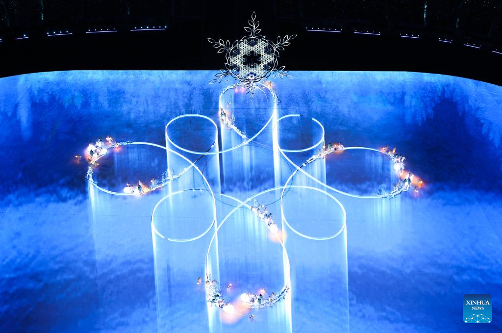 The risen Olympic rings pass by the giant snowflake cauldron during the closing ceremony of the Beijing 2022 Olympic Winter Games at the National Stadium in Beijing, capital of China, Feb. 20, 2022. (Xinhua/Xue Yuge)