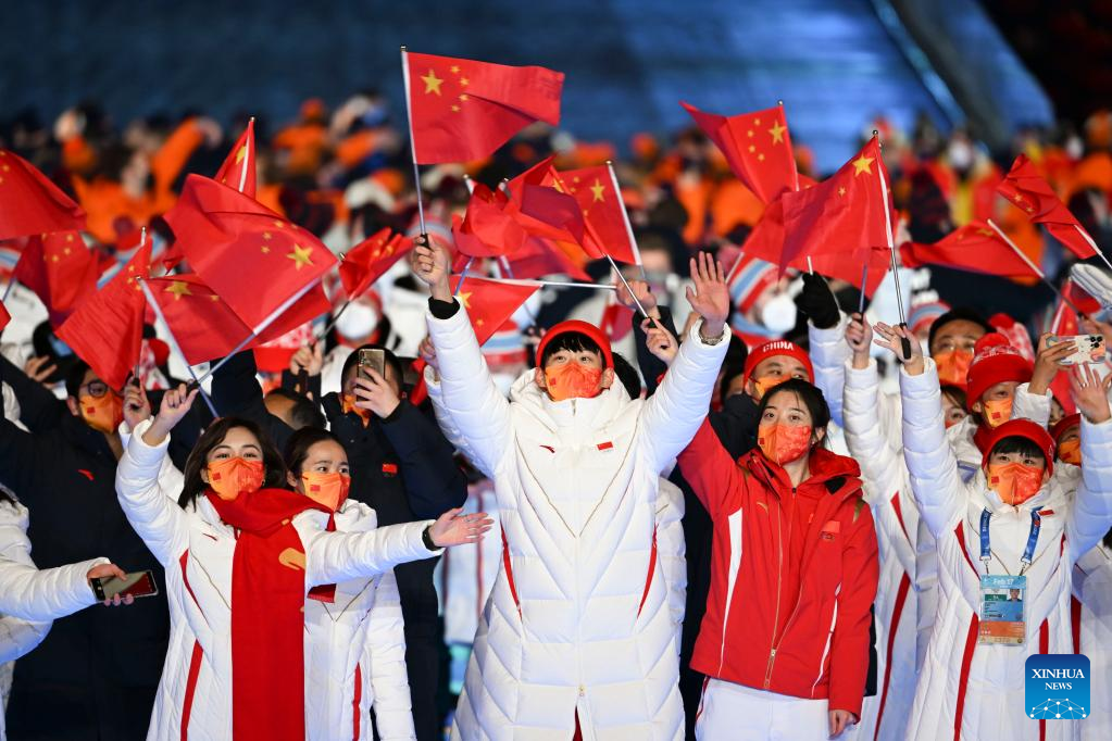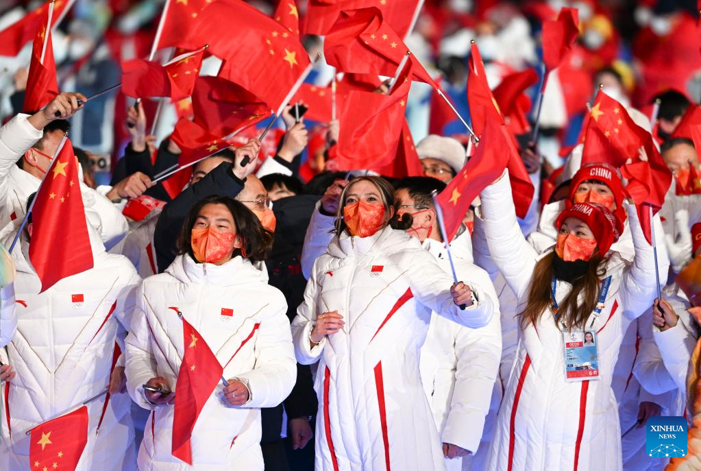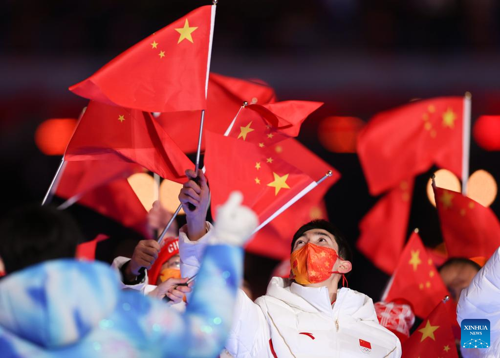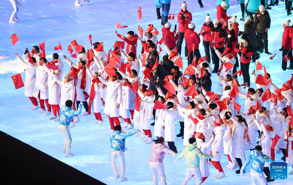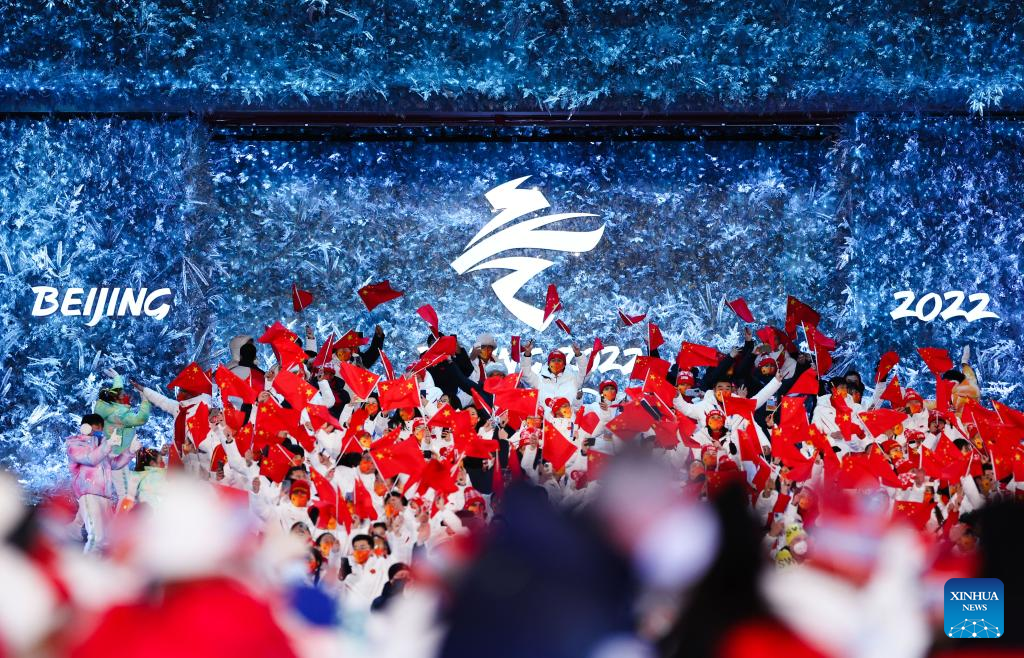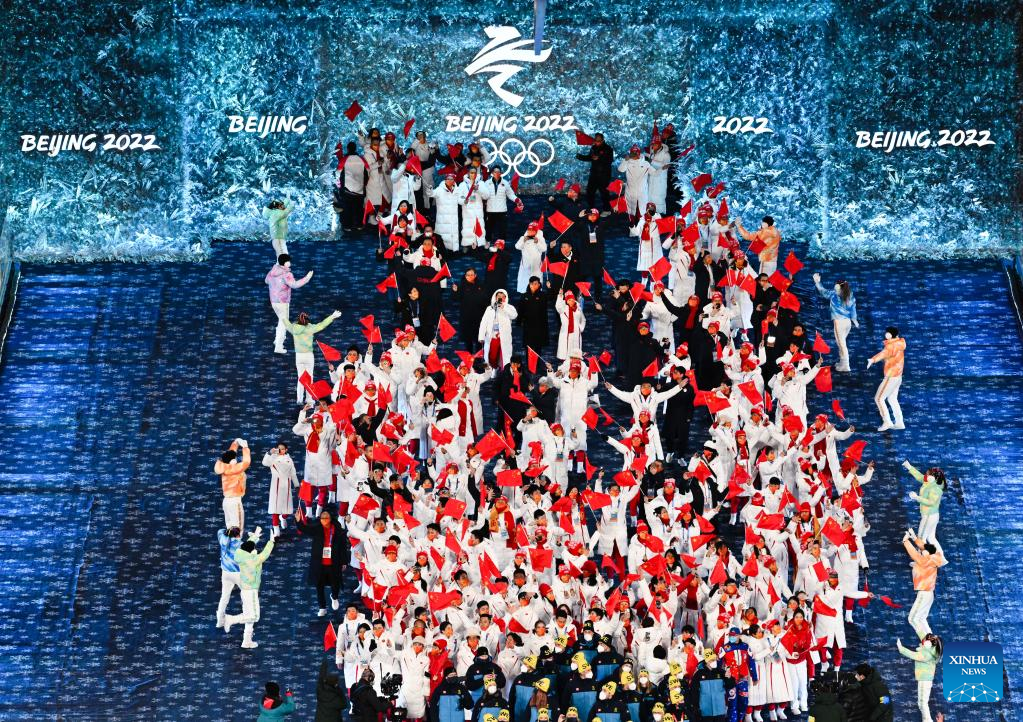 The Olympic delegation of the People's Republic of China parade during the closing ceremony of the Beijing 2022 Olympic Winter Games at the National Stadium in Beijing, capital of China, Feb. 20, 2022. (Xinhua/Huang Zongzhi)