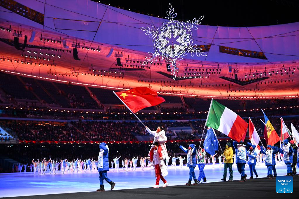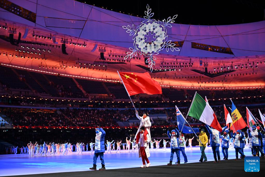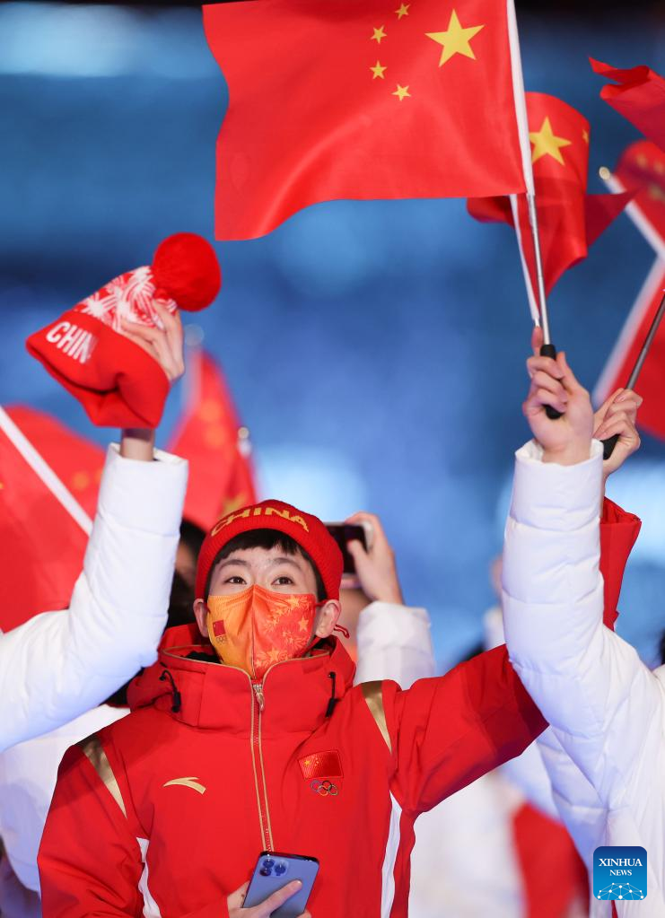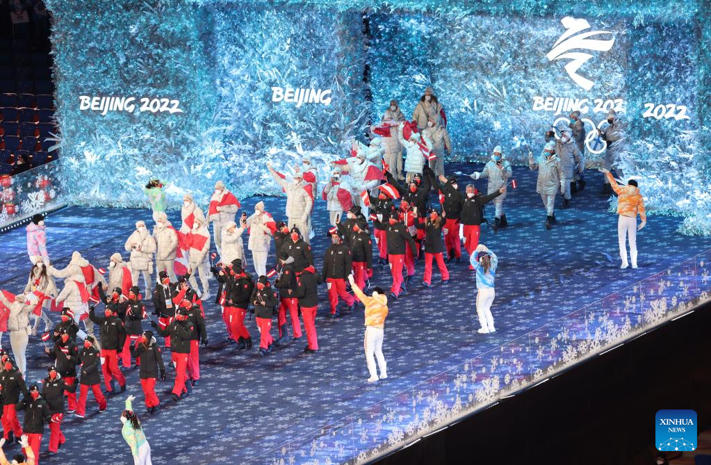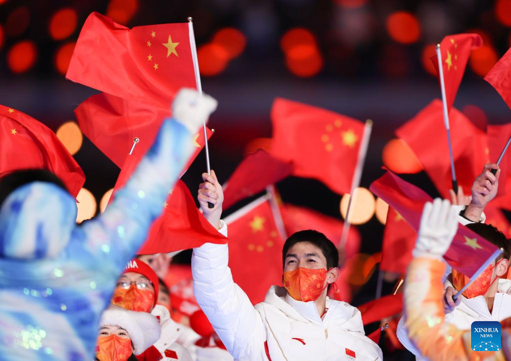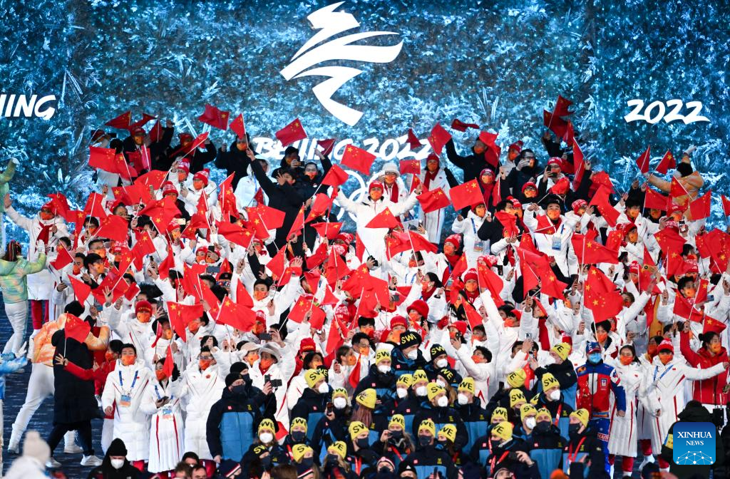 The Olympic delegation of the People's Republic of China parade during the closing ceremony of the Beijing 2022 Olympic Winter Games at the National Stadium in Beijing, capital of China, Feb. 20, 2022. (Xinhua/Huang Zongzhi)