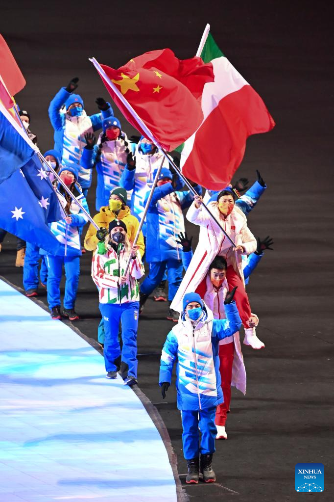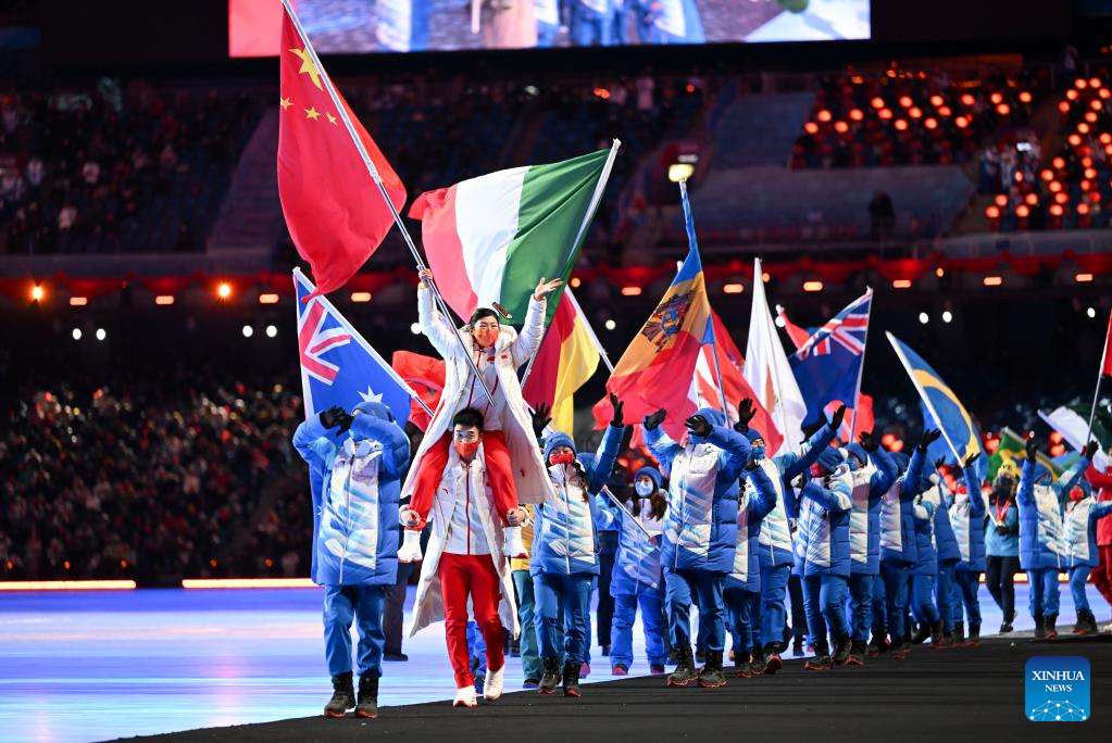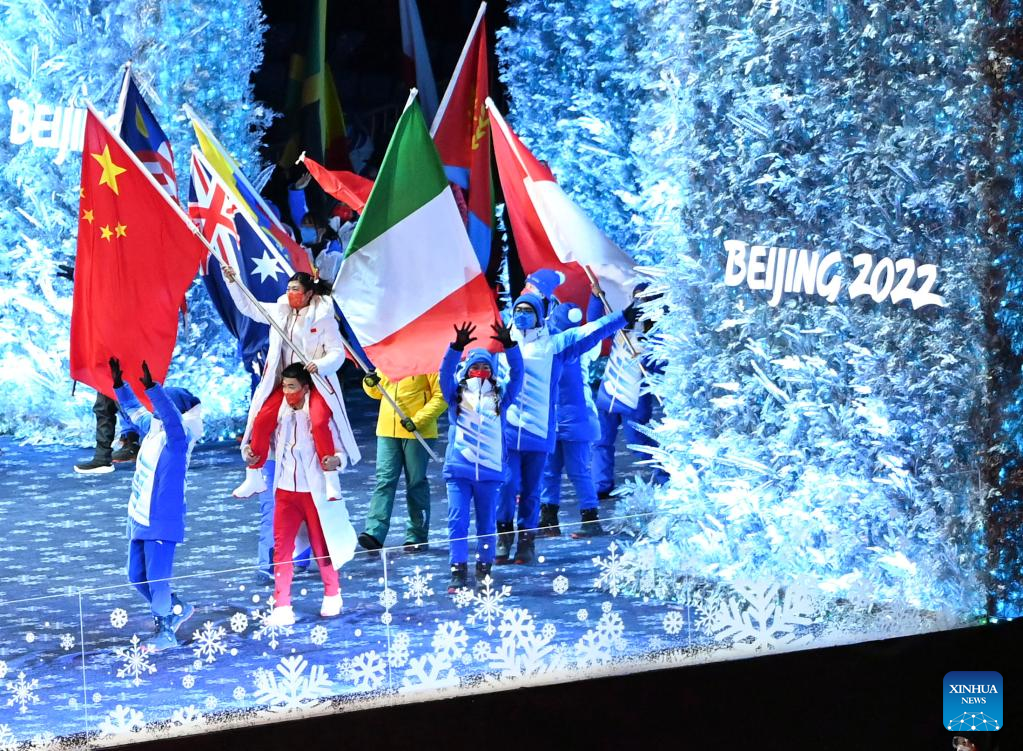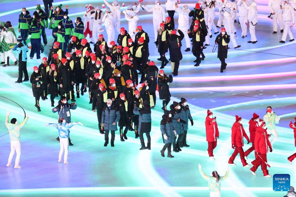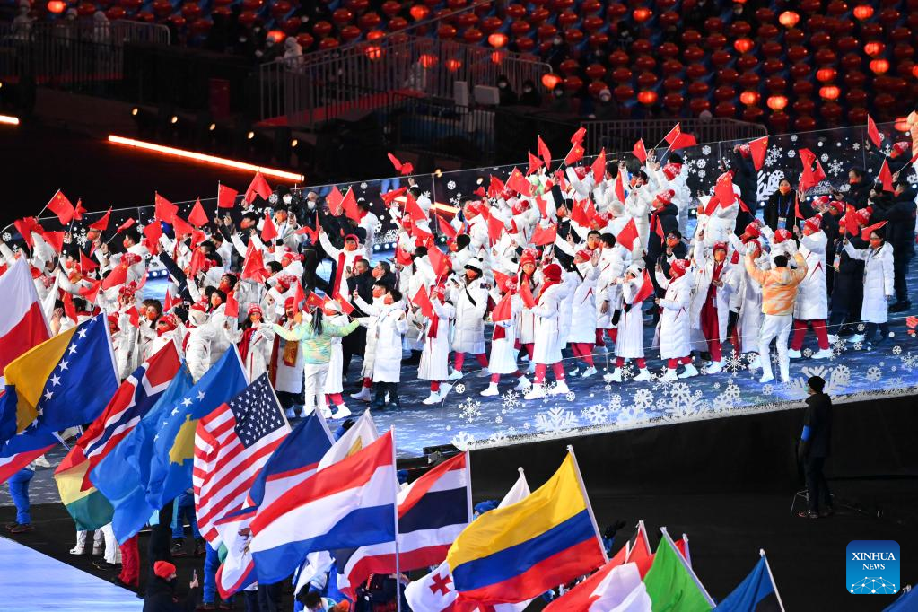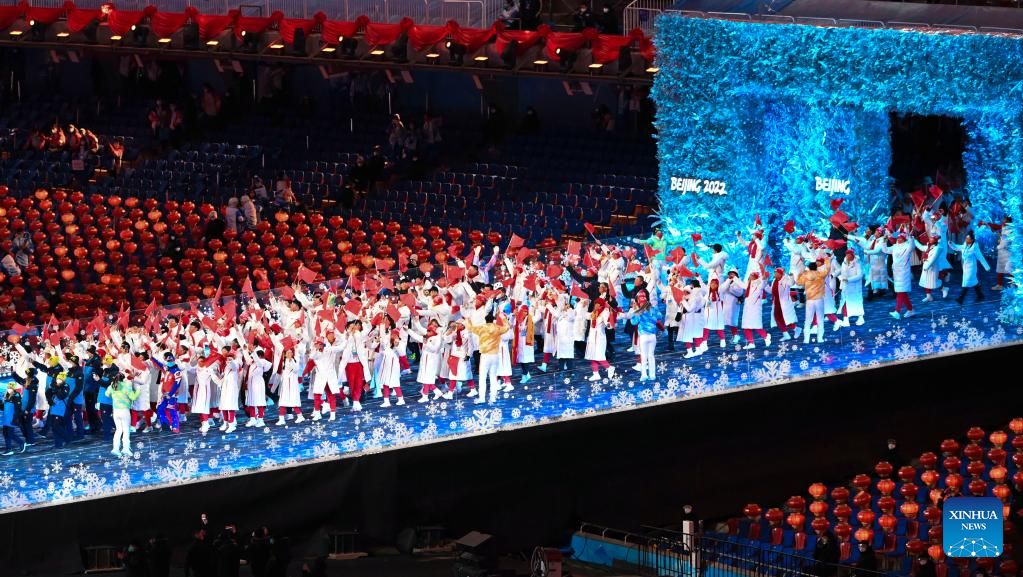 Athletes parade during the closing ceremony of the Beijing 2022 Olympic Winter Games at the National Stadium in Beijing, capital of China, Feb. 20, 2022. (Xinhua/Li Ga)